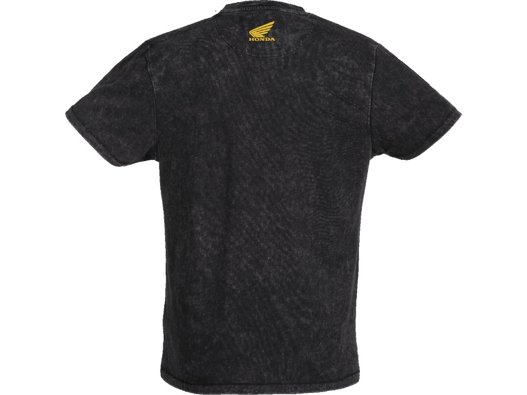 Zdobí ho popraskaný potisk retro helmy v kombinaci se zlatým logem Honda ve tvaru křídla, což vytváří odvážný a autentický vzhled.