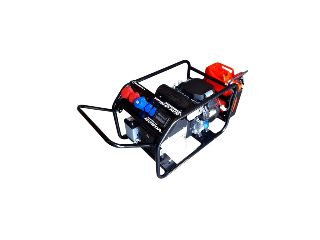 Tato robustní, benzínová elektrocentrála třífázového napětí je svým výkonem 12,0 kVA (3 f.) / 6kVA (1 f.) určena převážně "profíkům" pro napájení celého spektra třífázových elektrospotřebičů i těch, které jsou řízeny elektronikou a je přímo určena převážně řemeslníkům a profesionálům z oblasti stavebnictví a opravárenství. Svým výkonem se hodí do pojízdných autodílen, opravárenských vozů pro práci v terénu nebo na staveniště při zakládání staveb, údržbu silnic a dálnic a pod. Celá soustava je uložena na pružných silentblocích ve vyztuženém rámu, svařeném z ocelových trubek o průměru 30 mm. Ten zajišťuje mimořádnou ochranu soustrojí proti případnému poškození. Jako palivová nádrž slouží standardní 20 l kanystr, uložený v rámu stroje, který lze snadno vyjmout pro případné tankování. Vzhledem ke své hmotnosti je elektrocentrála opatřena transportním kolovým podvozkem. Proto, aby alternátor produkoval napětí 400V / 230V / 50Hz, je motor opatřen automatickým, mechanickým regulátorem otáček tak, aby při jakémkoliv odběru proudy byly otáčky motoru konstantní ve výši 3000 ot./min. Elektrický výkon elektrocentrály v úrovni "12 kilo" vyžaduje "pořádný" a silný, spolehlivý motor. Ten je zde ve formě benzínového vidlicového dvouválce GX630, který patří k nejvýkonnějším pohonným jednotkám na světě v kategorii 22 HP. Elektrocentrála je opatřena zásuvkovým panelem s přehledně rozmístěnými zásuvkami 1x CEE (32A 400V), 1x CEE (16A 400V), 1x CEE (32A 230V) a 2x CEE (16A 230V). Vedle zásuvek je umístěn krytý panel s jističi jak 400V, tak i 230V zásuvek. Ovládání elektrocentrály je velice snadné a jednoduché. Stačí natankovat, elektrocentrálu postavit na vodorovnou plochu, zkontrolovat olejovou náplň motoru, nastartovat otočením klíčku zapalování, počkat pár vteřin na ustálení chodu motoru a do příslušné zásuvky připojit napájený spotřebič. Elektrocentrála splňuje veškeré nároky na elektrickou bezpečnost a je opatřena ochrannými prvky jako je ochrana motoru proti úniku oleje nebo alternátoru proti přetížení. Robustní a pevná konstrukce rámu se nekroutí a spolehlivě tlumí působení vibrací od soustrojí na podklad. Snižuje se tak hlučnost elektrocentrály a práce je potom příjemnější. Elektrocentrálu lza za příplatek vybavit zemnícím kolíkem, a nebo automatikou startu AMF. Údržba elektrocentrály je zcela nenáročná a spočívá v základní údržbě benzínového motoru.